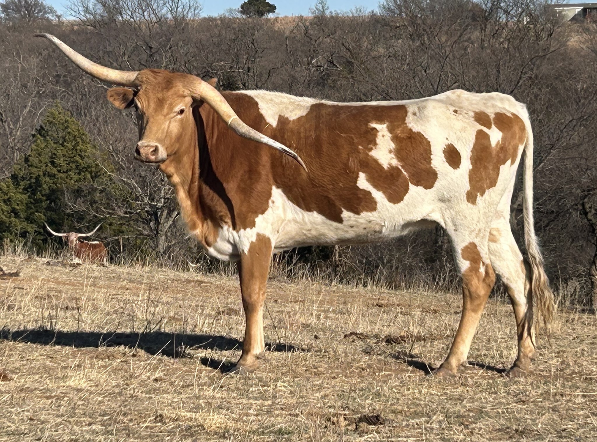 B Fancy came to us straight off the Safari B Ranch, her mom is a beautiful feminine longhorn cow, who has bred back for us right on time, and a very attentive cow, good milker and great udders. Fancy has a beautiful light red coloring great disposition, and easy going. She is going to be exposed to All Jacked up DSM for her first breeding.